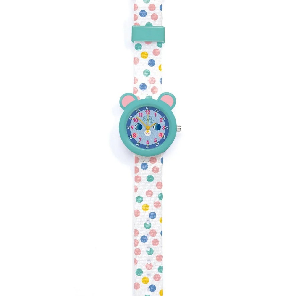 Dit kinderhorloge van Djeco heeft een vrolijk verstelbaar bandje gemaakt van textiel en op de wijzerplaat een mooie afbeelding van een muis . Het horloge is schokbestendig, waterdicht tot 3 bar en wordt geleverd inclusief batterij. Lees meer