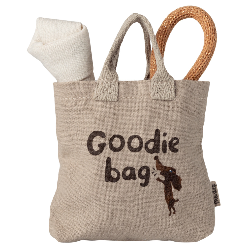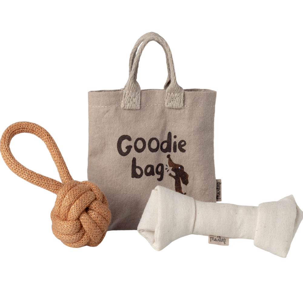 Deze leuke set met speeltjes is speciaal gemaakt voor de kleine puppy's van Maileg, maar kan natuurlijk ook gebruikt worden voor andere knuffels. De set bestaat uit een handig tasje, een botje en een speeltje.