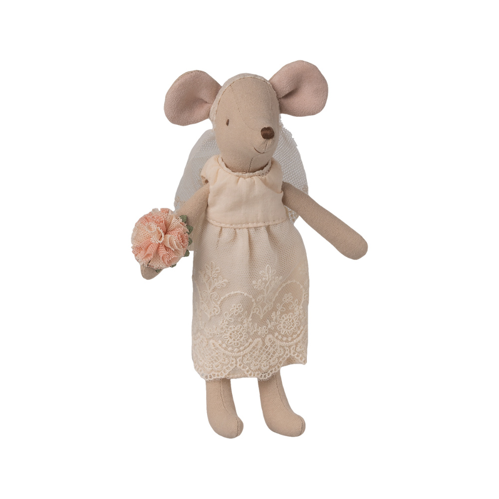 Een echte trouwjurk voor moeder muis om zich prachtig aan te kleden voor haar grote dag! Deze Maileg set bevat een mooie jurk en natuurlijk een lange sluier. Het mooie boeket maakt het geheel helemaal af.