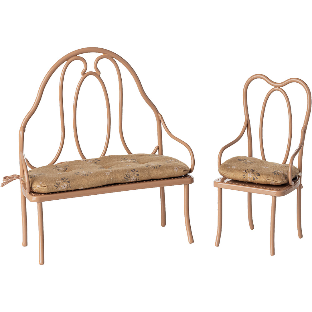Deze mooie vintage stoel is gemaakt van metaal en speciaal ontworpen voor de konijnen maat 1 en 2 van Maileg. Deze dark powder stoel is 15,5 cm hoog en past goed bij het vintage bankje van Maileg. Lees meer